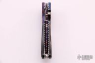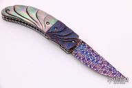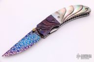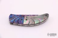 This knife features a blued Damascus blade with a single thumbstud with orange stone inlay. The handle has carved blued Damascus bolsters, carved black lip pearl scales, fileworked stainless steel liners and backspacer. Excellent condition.