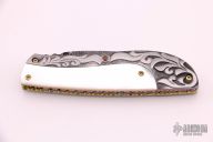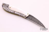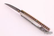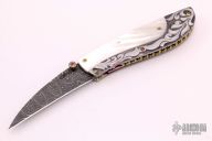 This knife features a Damascus blade with single thumbstud with red stone inlay. The handle has carved steel and mother of pearl scales, fileworked and anodized titanium liners and backspacer with yellow stone inlay. Excellent condition.