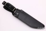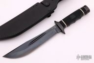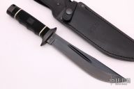 This CD-02 Creed Bowie from SOG Knives features a black coated clip point blade with swedge and fuller. The handle has a stainless steel guard and pommel with rubberized grip over hidden tang construction. Includes leather sheath with belt loop.  Light scuffs are visible on the blade and guard otherwise the knife is in excellent condition.