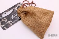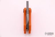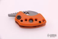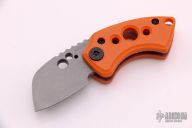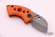 This Gnat Friction Folder by Justin Koch of Koch Tools features a chisel ground tumble finished blade with swedge, notched thumbrest and friction bar. The handle is comprised of orange G-10 scales over a titanium barrel spacer. Lanyard hole in pommel. Includes makers card dated 4/21, Koch pouch and COA. Excellent condition.