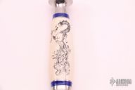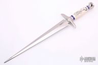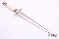 This dagger by Edward N Kalfayan features a mirror polished double-edged blade, .246" blade stock and 1.5" blade depth, hidden tang construction. The handle has a mirror polished stainless steel guard and pommel, lapis spacers and a mammoth grip. The scrimshaw was done by Sandy Brady. Has some light scratches, and a crack in the grip, otherwise good condition.