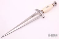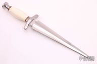 This dagger by Edward N Kalfayan features a mirror polished double-edged blade, .250" blade stock and 1.809" blade depth, hidden tang construction. The handle has a mirror polished stainless steel guard and pommel, brass spacers and a mammoth grip. Has some light scratches, and a crack in the grip, otherwise excellent Condition. Includes a padded zippered case.