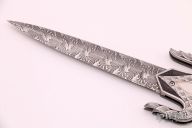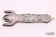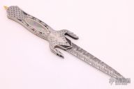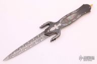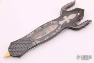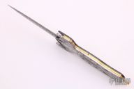 This Auto by Master Smith Ron Newton features a Damascus blade with false top edge. The handle has a stainless steel frame with black lip pearl inlays and a gold backspacer.  Half of the frame has been blued. The handle has been beautifully engraved and has gold inlays. The release is hidden among one of the forward prongs.  Stunning piece, amazing attention to detail.  Includes a padded zippered case.  Excellent Condition.