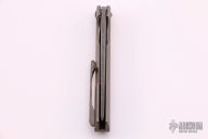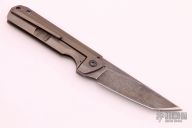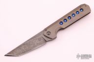 This Kwaiken by Tuff Knives, features a tumble finish tanto blade with notched flipper tab. The handle is composed an orange peel finish anodized titanium scale and frame. The matching tip up pocket clip is composed of titanium and the backspacer is titanium as well. Excellent fit and finish. Dead center blade seating, smooth action and nice detent. Includes C.O.A. and zipper case. Excellent Condition.