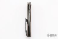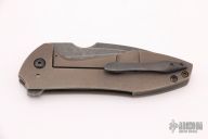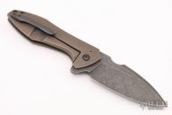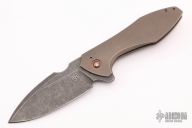 This Tracer by Tuff Knives features an acid tumble finished blade with flipper. The handle is comprised of an anodized tumble finished titanium frame, orange peel zirconium backspacer and tip up sculpted zirconium clip. Nice lockup, detent and blade seating. Comes with a zipper case. 5Has some light scuffs, otherwise good condition.