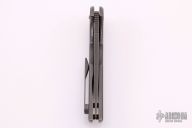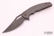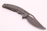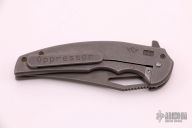 This Opressor from Ferrum Forge and Blade Junkee features a tumble finish upswept clip point blade with thumbhole notched thumbrest and flipper. The handle is tumbled titanium with matching clip. Anodized and bead blast finished hardware, and standoffs. Has lockbar insert, and has 23 marked on the frame. Some minor rust/blemishes on the blade near thumbhole and on spine of blade - otherwise excellent condition. Comes with hard plastic case.