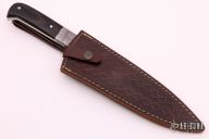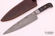 This Chef's Knife features a Damascus drop point blade with 0.140" blade stock and 1.764" blade depth. The handle has Damascus bolsters and micarta scales over brass liners and a full tang construction. Includes a brown leather sheath.  Oxidation is visible on the blade and bolsters.