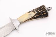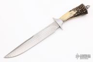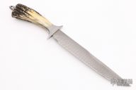 This fighter by Michael Veit features a Turkish Twist Damascus blade with false top edge, .258" blade stock and 1.312" blade depth, hidden tang construction. The handle has a matching Damascus guard and butt with a nice stag grip. Comes with a zippered case. Excellent condition. The Damascus might be Rados Turkish Twist, but not 100% sure.