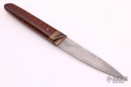 This knife by Anders Hogstrom features a Damascus blade with .228" blade stock and .886" blade depth, hidden tang construction. The handle has a textured and antiqued copper guard and pin with a snakewood grip. Comes with a wooden display box and a zippered case. Excellent condition.
