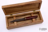 "I make mostly daggers, fighters and what I call “Kwaikens” but also swords and folding knives. I primarily use 1050 carbon spring steel and damascus of various compositions and on occasion, stainless steel for the blades. For the 1050 I employ a clay “tempering” technique that gives the blade a beautiful temper line (hamon) as well as a hard edge while maintaining a flexible core of the blade. These blades are rough ground and then finished off by hand with files and sandpaper before the final stage of etching the blade to bring out the hamon. When it comes to damascus, I tend to lean towards a simpler random or a twist pattern that goes with the overall simplistic scheme of my knives. These blades are worked and finished in a similar fashion as the carbon steel ones. I use stainless steel, mostly Damasteel stainless damascus, for folders, art knives ( for ex. Skull Cleaver and Druid Sickle) and some full-tang dress-knives, my Tuxer model, or upscale hunting/skinning-knives. For the handles and wooden sheaths I use rare exotic hardwoods, ancient ivories and bone material from all over the world. Even large pieces of natural amber has found its way onto a couple of my knives. A few wood favorites are Snakewood for its amazing striped grain pattern, Masur birch, Eucalyptus , and Redwood burl for its sometimes silky appearance."