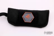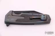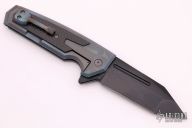 This Allen Elishewitz Tank Flipper Mid-Tech features a black and satin finished tanto blade with notched thumbrest and flipper. The handle has a milled and anodized titanium frame with carbon fiber inlays, anodized titanium backspacer and a tip up anodized titanium clip that was milled to look like a tank turret. Comes with a velcro case. Wear on the blade finish, otherwise good condition.