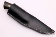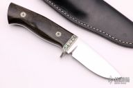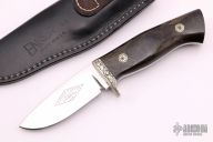This knife was designed by Buster Warenski and produced by Ensign Knives.  This knife features a mirror polished blade, an engraved nickel silver guard and dyed wood scales over a tapered tang construction.  .168" Blade Stock.  1.075" Blade Depth.  The guard and pins were engraved by Buster Warenski.  Includes a black leather sheath.  Light patina is visible on the guard and pins otherwise the knife is in excellent condition.