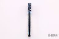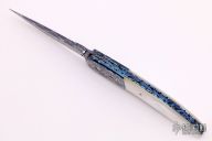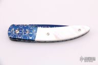 This knife by Rick Dunkerly features a colored Damascus blade with false top edge and a single file worked thumb stud. The handle has colored Damascus bolsters with matching pattern to the blade, mother pearl scales, heat colored and file worked stainless steel liners and backspacer.  One of the scales has a small chip along where scale meets the liners otherwise the knife is in Excellent condition.  Includes a padded zippered case.