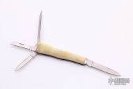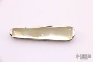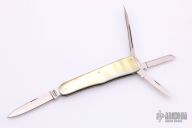 This lobster knife features three hand-rubbed satin finish blades and a pick, high polish stainless steel double bolsters, and gold lip pearl covers. File work on liners. Blades open and close with a nice snap. Great looking pearl scales. Excellent Condition.