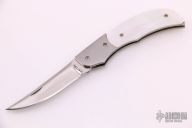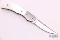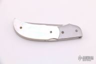 This Mid-Lock by Ralph Turnbull features a mirror finished blade with nail nick. The handle has steel bolsters, mother-of-pearl scales, file worked stainless steel spring and nickel silver liners. Comes with a zippered case. Scuffs and scratches are visible on the blade and handle.  One pearl scale has a crack at the butt of the handle.
