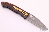 This Dejavoo by Benchmade features a Damasteel drop point blade with false top edge and thumbhole. The handle has desert ironwood scales, anodized titanium liners, and gold-plated hardware. Tip down pocket clip. Includes the original box and COA, Dated 3/24/08. Excellent condition.