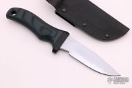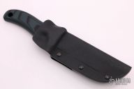 This Bug Bug by MadDog Knives has a hard chromed, double-edged blade with VVTL finish (very visible temper line) Razor sharp edges with a type 1 choil, the black and green handle material is the proprietary glass / epoxy composite -- compression bonded to the hidden full tang and incredibly ergonomic. .191" blade stock and 1.005" blade depth. Mad Dog trademark on the ricasso – it is the PERFECT knife for everyday carry. The knife comes with a high ride kydex belt sheath. Excellent condition.  Has a Rockwell C-scale hardness of 62 at the edge (as hard as a file), and HRC 50-54 throughout the spine and hidden full tang. The handle is designed to be ergonomic and has the ability to withstand tremendous punishment with little or no damage.  New From Maker!