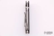 This TAD Dauntless Compact Hinderer Midtech Edition features a matte finished spear point blade with fullers, notched thumbrest, and dual thumbstuds. The handle has a black G-10 front scale with 3 milled fullers, matte finished titanium frame with matching tip up clip. This knife features the Tri-Way pivot system. Has some light scratches otherwise excellent condition.