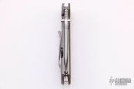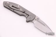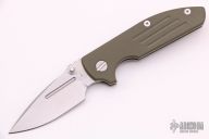 This TAD Dauntless Compact Hinderer Midtech Edition features a matte finished spear point blade with fullers, notched thumbrest, and dual thumbstuds. The handle has a green G-10 front scale with 3 milled fullers, matte finished titanium frame with matching tip up clip. This knife features the Tri-Way pivot system. Has some light scratches otherwise excellent condition.