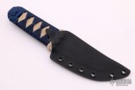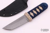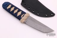 This 4" Oregonto from Ben Tendick of B.R.T. Bladeworks features a tumbled tanto style blade with swedge. .173" Blade Stock. 1.24" Blade Depth. The handle features a blue Tsuka Ito and cream hemp cord under wrap. Includes a kydex sheath. Brand New from Maker.
