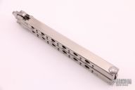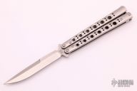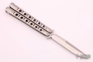This Model 42 Balisong by Benchmade features a tumbled finished blade with swedge. The handle has an integral skeletonized stainless steel handles with spring T latch on pommel. Comes with nylon sheath. Light scratches are visible on the frame otherwise the knife is in Excellent Condition.