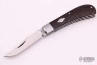 This Trapper from Pepe Jalomo features a hand rub satin finished blade with nail nick. The handle is comprised of stainless steel bolsters, maroon canvas micarta covers with a stainless steel escutcheon, pins, and liners, stainless steel spring. Spring is flush in the closed, half stop, and open positions. Comes with zipper case. Has some light scuffs and scratches on the bolsters, covers, and blade, otherwise good condition.