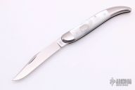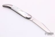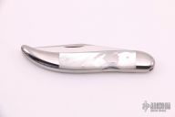 This Midlock folder by Ryuichi Kawamura features a hand rubbed satin finished blade with mirror polished ricasso, has a nail nick and false top edge. The handle has integral stainless steel bolsters and liners, escutcheon and spring, mother of pearl scales. Has some light scratches, otherwise excellent condition. Comes with a zipper case. Another beautiful piece from Ryuichi.
