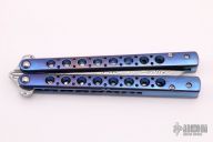 This Balisong by Terry Guinn features a Damascus blade with swedge. The handle has an anodized skeletonized titanium frame and backspacers. T latch in pommel. Pivots on IKBS bearings.  Marked #212. Excellent condition.  Includes padded zippered case.