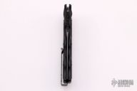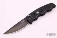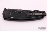 This SOG-TAC Auto has a black finish upswept blade with notched thumb rest. Handle is black anodized aluminum with safety, lanyard hole, and stainless steel tip up clip - RH/ LH reversible. A few dings and scratches on handle around auto button, carry marks on pocket clip and scuffs on blade. Fair condition.