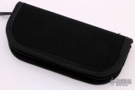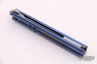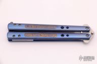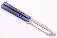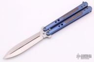 This Balisong by Chuck Gedraitis features a satin finished dagger style blade with a false top edge.  The handles are composed of anodized titanium with mokuti inlays over titanium backspacers.  Mokuti T-Lock.  Light scratches are visible on the handle otherwise the knife is in good condition.  Includes a padded zippered case.