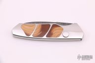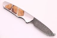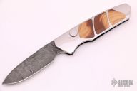 The knife by Scott Sawby features a Damascus blade with nail nick. The handle has a mirror polished stainless steel frame with Jasper inlays. Nice blade seating and lockup and closes via Scott's bottom lock release. A truly elegant piece with class. Excellent condition. Comes with a velcro case.