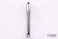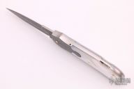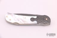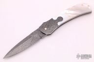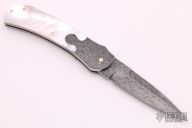 This Gents lockback auto by the Late Warren Osborne features a Damascus blade with false top edge. The handle has Damascus bolsters, mother of pearl inlays, stainless steel backspacer and liners, and gold pins. Nice lockup, action and blade seating. Comes with a zippered case. Excellent condition.