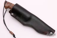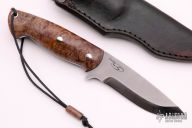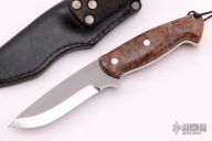 This Bushcrafter by Cosmo Knives features a scandi ground blade with .193" blade stock and 1.141" blade depth, full tang construction. The handle has box elder burl wood scales with black liners and a lanyard hole. Comes with a black leather sheath. #2806 on the blade. Excellent condition.