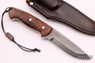 This Bushcrafter by Cosmo Knives features a scandi ground blade with .271" blade stock and 1.207" blade depth, full tang construction. The handle has maple burl wood scales with a lanyard hole. Comes with a brown leather sheath. #2692 on the blade. Excellent condition.