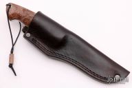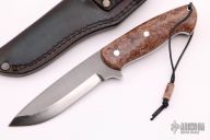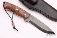 This Bushcrafter by Cosmo Knives features a scandi ground blade with .249" blade stock and 1.218" blade depth, full tang construction. The handle has box elder burl wood scales with black liners and a lanyard hole. Comes with a brown leather sheath. #2831 on the blade. Excellent condition.