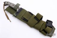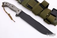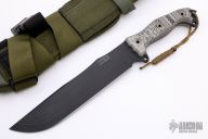 This Battle Mistress from Busse Knives features a black coated blade, .243" blade stock and 2.115" blade depth. The handle is comprised of black and grey G-10 over full tang construction with hollow pins and exposed tang pommel with lanyard holes. Includes a green nylon sheath with kydex insert. Excellent condition.
