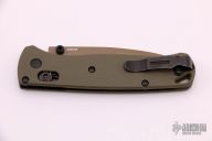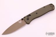 The Benchmade Bugout Desert Warrior SMKW Exclusive features a 3.24" CPM-M4 drop point blade with a flat earth Cerakote finish. It's a manual opener with ambidextrous thumb studs. This AXIS lock has SMKW Exclusive textured OD green G-10 handles with black oxide liners and hardware, black anodized barrel spacers, a black oxide mini deep-carry pocket clip, and a lanyard hole.  Includes original box and papers.  Excellent Condition.