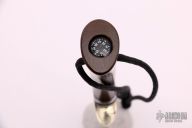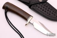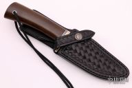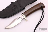 This Stanaback Special from Randall Made Knives features a satin finished clip point blade with sharpened swedge and notched thumbrest. 0.214" blade stock and 1.133" blade depth. The handle is comprised of a nickel silver single guard with black and duralumin spacers and brown linen micarta scales over hidden tang construction, has a compass in the butt. Includes hand tooled black leather sheath with belt loop. New from Capt. Stanaback.