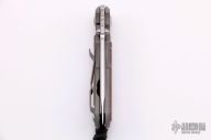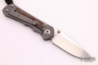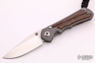 This Small Inkosi by Chris Reeve Knives features a tumble finished drop point blade with dual thumb studs and notched thumb rest. The handle is comprised of a bead blasted titanium frame with natural canvas micarta inlays over a single barrel spacer. The bead blasted titanium clip. Lanyard on pommel. Includes original box, tools, microfiber cloth and paperwork dated November 28, 2018. Has a couple light scuffs, otherwise good condition.