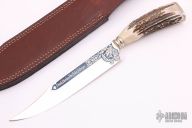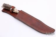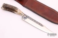 This bowie by Friedr. Herder Abr. Sohn, Solingen features a mirror polished blade with deep floral etching with blue background on both sides of the blade, .166" blade stock and 1.388" blade depth, hidden tang construction. The handle has a fluted nickel silver guard and butt plate, stag grip. Comes with a brown leather sheath. Not original. Has a few light scratches, otherwise excellent condition.