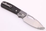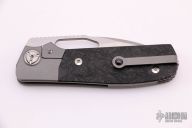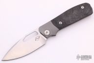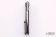 This Field Duty by Reate is a Liong Mah design, it features a satin finished blade with notched thumbrest and a thumb hole. The handle has a blasted titanium frame with marble carbon fiber scales, matching backspacer and tip up clip, lanyard pin. Excellent Condition. Comes with original zippered case and papers. New condition.