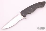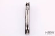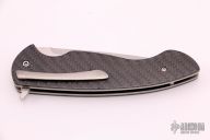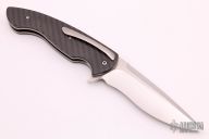 This Commander XL framelock flipper by Frank Fischer features a hand rub satin finished spear point recurve blade with flipper. The handle has carbon fiber scales, orange peel finished titanium liners and tip down clip with hidden screws. Nice detent, lockup and blade seating. Excellent condition. Comes with a nylon zippered case.