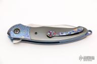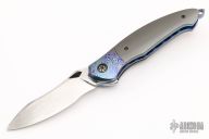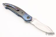 This Nebula by Peter Martin is a Faisal Yamin design, it features a Damascus blade with a mokuti thumblug and a flipper, notched thumbrest. The handle has Mokuti bolsters with zirconium pivot collars, zirconium scales, anodized titanium liners, mokuti backspacer and tip up clip with hidden screws. Marked "MARTIN" inside backspacer. Nice detent, lockup and blade seating. Has a few very light scratches, otherwise excellent condition. Comes with a zippered case.