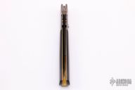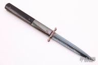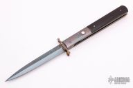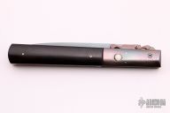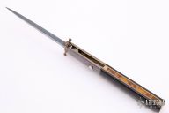 This one-of-a-kind XXL Swing-Guard by Reese Weiland features a blued Damascus blade with false top edge, orange peel finished and anodized titanium swing-guard, blued Damascus dovetailed bolsters, desert ironwood scales, jeweled and anodized titanium liners, bronze backspacer with faux tortoise shell inlay over gold leaf. Button has mammoth ivory inlay. Perfect function, strong lockup, beautiful materials. Excellent condition. "RW PMS3" inside backspacer. Comes with a zippered case.
