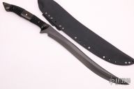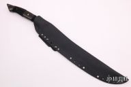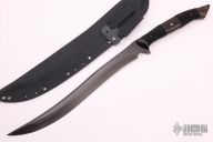 This Windstorm Sword from Barry Dawson features a blued blade with nice hamon, a nearly sharpened top edge and fileworked spine, .238" blade stock and 1.693" blade depth, full tang construction. The handle is comprised of black paracord Japanese style wrap over black canvas micarta scales. Includes a kydex sheath. Excellent condition.
