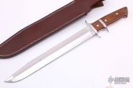 This Loveless Style Sub-Hilt Fighter from Forge Master K. Ali features a mirror finished double edged blade, .204" blade stock and 1.503" blade depth, full tapered tang construction. The handle features 304 stainless steel guard and sub-hilt, brown canvas micarta scales with red liners, stainless steel pins, lanyard hole at the butt. New from maker. Includes brown leather sheath and original box.