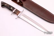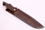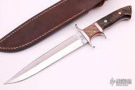 This Loveless Style Big Bear Fighter from Forge Master K. Ali features a mirror finished double edged blade, .197" blade stock and 1.305" blade depth, full tapered tang construction. The handle features 304 stainless steel guard and sub-hilt, rams horn scales with red liners, brass/stainless steel pins, lanyard hole at the butt. Includes brown leather sheath and original box. New from maker.