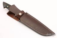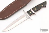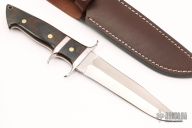 This Loveless Style Big Bear Fighter from Forge Master K. Ali features a mirror finished double edged blade, .197" blade stock and 1.407" blade depth, full tapered tang construction. The handle features 304 stainless steel guard and sub-hilt, black burlap micarta scales with red liners, brass/stainless steel pins, lanyard hole at the butt.  Includes brown leather sheath and original box. New from maker.