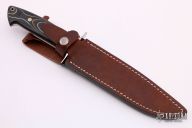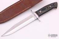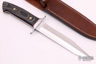 This Dixon Fighter by Forge Master K. Ali features a mirror polished double edged blade, .152" blade stock and 1.334" blade depth, full tapered tang construction. The handle has a mirror polished stainless steel guard, black/brass/silver canvas micarta scales with red liners, lanyard hole at the butt. Comes with original box and a brown leather sheath. New from maker.