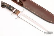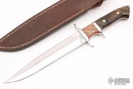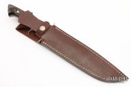 This Loveless Style Big Bear Fighter from Forge Master K. Ali features a mirror finished double edged blade, .200" blade stock and 1.441" blade depth, full tapered tang construction. The handle features 304 stainless steel guard and sub-hilt, rams horn scales with red liners, brass/stainless steel pins, lanyard hole at the butt. Includes brown leather sheath and original box. New from maker.